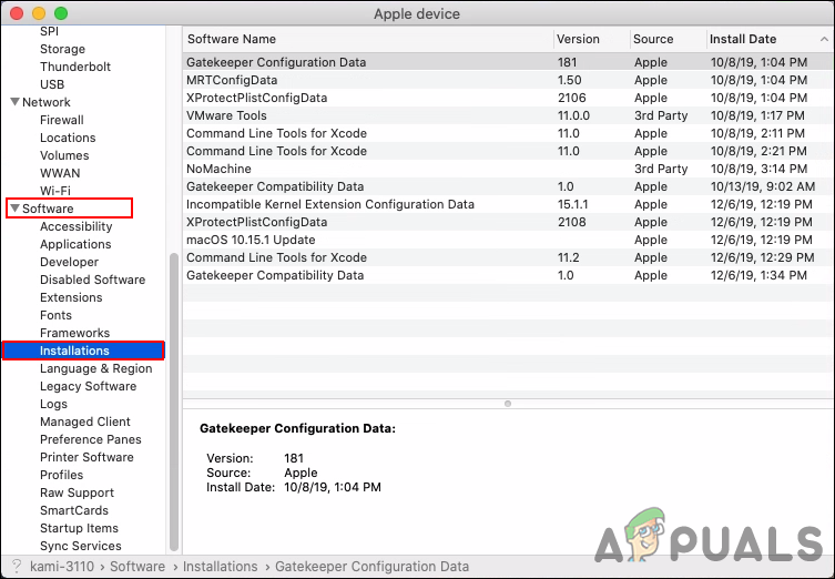 Checking applications version and date of modification - You can also view other software by selecting the Installations option under the Software section. This will show you a complete list of installed updates.