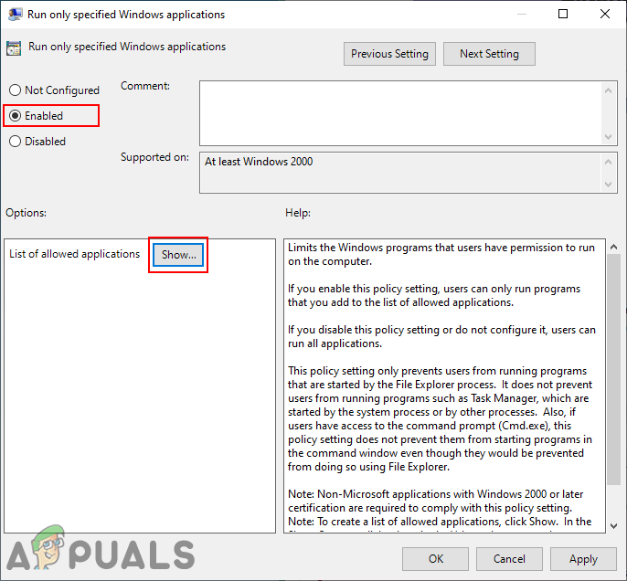 Navigating to the setting - Double-click on the setting named “Run only specified Windows applications” and it will open up in another window. Now change the toggle option to Enabled and click on the Show button.
