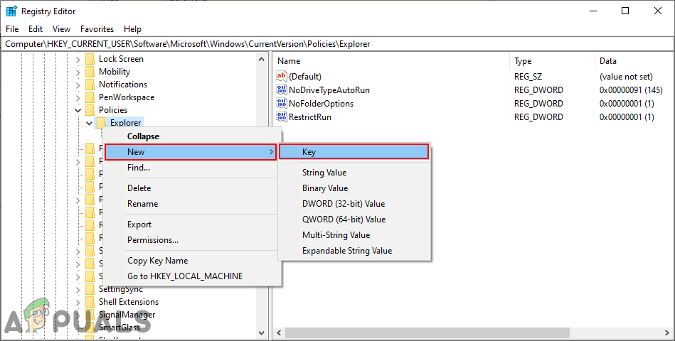 Enabling the value - Next is to create another key under the Explorer key by right-clicking on the key and choosing the New > Key option. This value should be named “RestrictRun“.