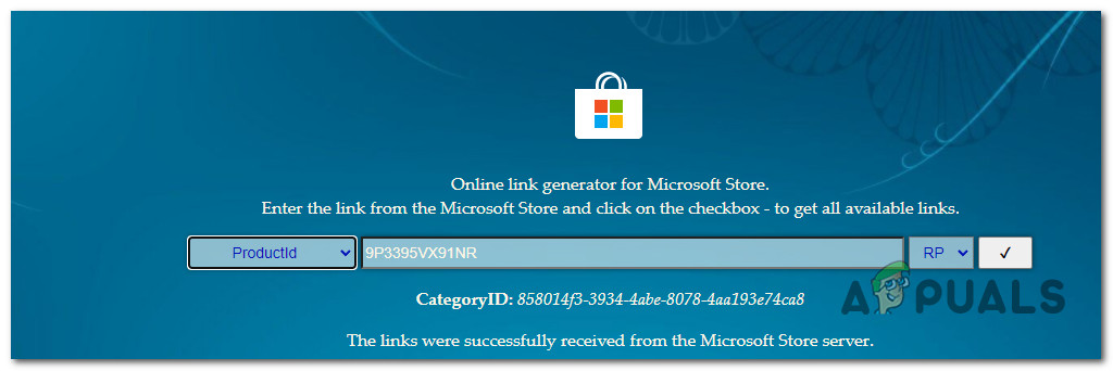 - On the Online link generator page, select ProductID from the first dropdown menu, then enter 9P3395VX91NR in the box, and click the OK icon to search.