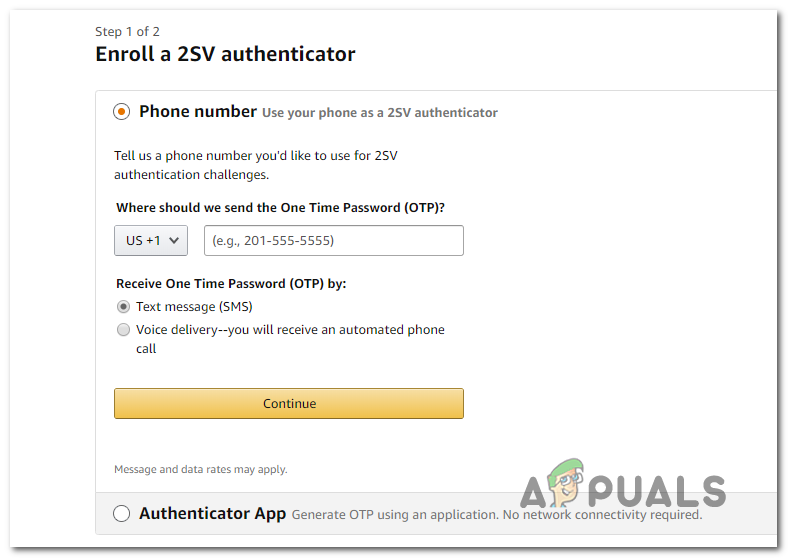 Enabling Two-Step Verification on Amazon Prime - On the next screen, enter your phone number, select your preferred delivery method and click Continue.