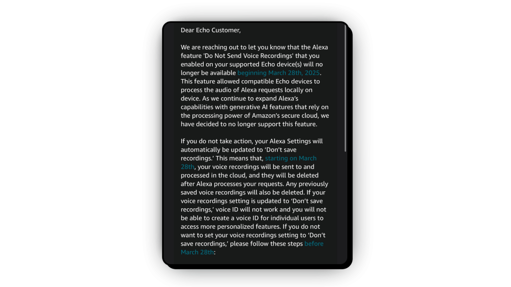 Echo users will now have to submit to having their voice requests processed on Amazon’s cloud. In an email to Echo users, the company stated that the “Do Not Send Voice Recordings” feature will no longer be available and that if no action is taken, the settings will default to “Don’t save recordings,” meaning each request will be deleted after being processed on the cloud.