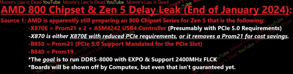 Moore’s Law Is Dead shared a snippet of AMD’s upcoming motherboard lineup set to arrive later this year. The 800 series of motherboards based on AM5 are expected to be announced by Computex in June. However, the launch date may be pushed back, with a similar story repeating for Zen5 CPUs as well.