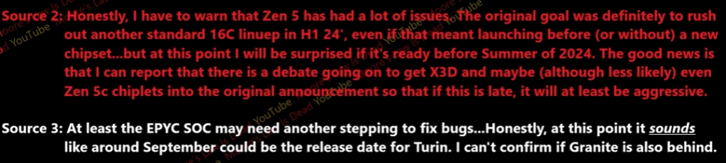 MLID is hearing similar things regarding Turin due to bugs with the EPYC SOC, which may require another stepping to iron out stuff. The expected release date of Turin is around September, but that doesn’t reflect Granite Ridge’s (Zen5) launch schedule.