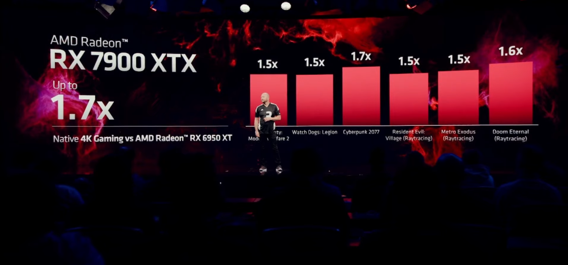 The RX 7900 XTX offers up to 1.7x more performance in raw rasterization at 4K. Moving over to ray tracing, team red promises a 50-60% lead over last-generation, but no comparisons against Team Green on stage were shown.