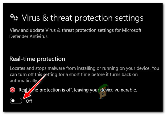 Accessing the Virus & threat protection - Click Manage Settings and turn off Real-Time Protection.