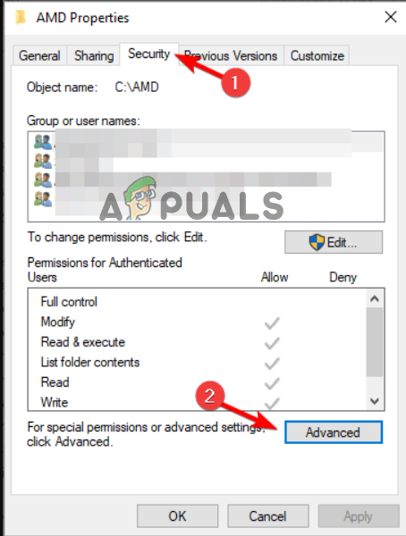 - Switch to the Security tab and click Advanced.