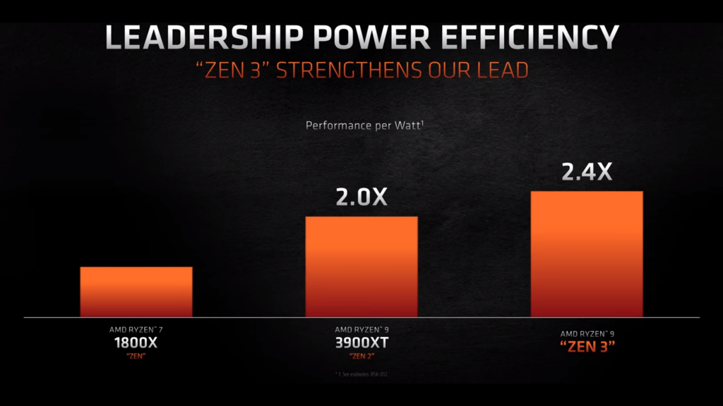 AMD has also made a bold claim that the Ryzen 9 5900X and 5950X will consume the same amount of power as the last-gen 3900X and 3950X respectively, despite having higher boost clocks and the improved IPC. AMD’s promotional material quoted a “2.4X Performance per Watt” improvement over the original Zen architecture. This number lines up with AMD’s claims of the power draw of 5900X and 5950X since they now have higher clocks but still have the same TDP numbers as their predecessors.