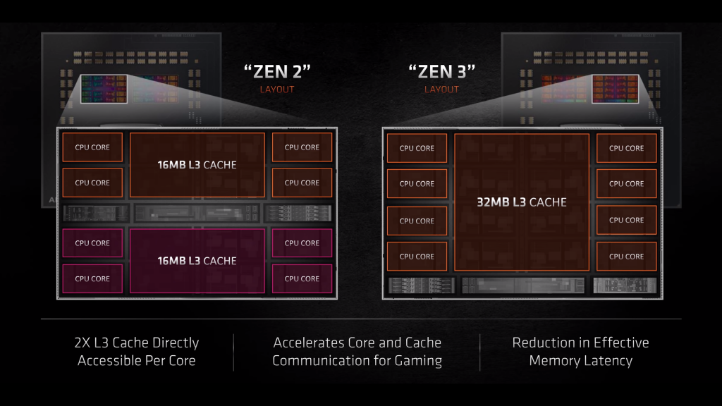 Arguably the biggest improvement with the new architecture was the all-new layout. AMD has done away with the multiple-CCX design of Zen 2 and has instead gone with a single 8-core Complex design in which all the 8 cores have access to the entire 32MB of L3 cache. This redesign has huge implications in latency-sensitive applications like games.