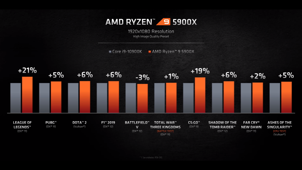 Moreover, AMD has also claimed that the Ryzen 9 5900X is faster than the Core i9-10900K in gaming. This is pretty huge news for AMD fans who and for general PC enthusiasts. This now means that the top AMD CPUs beat the top Intel CPUs in both gaming and multi-core applications. It doesn’t help Intel’s case that they are still stuck on the archaic 14nm architecture and their next-gen Rocket-Lake processors are also rumored to be on 14nm. Meanwhile, AMD is firing on all cylinders with their 7nm offerings in Zen 2 and Zen 3, while also concurrently working on the 5nm plans which are apparently on-track as well. This can have serious implications for Intel’s desktop CPU market share.