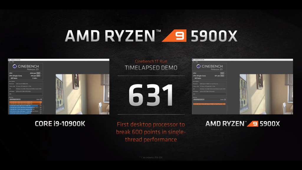 This also means that AMD’s single-threaded performance is now vastly superior to Intel’s. In fact, AMD showed off an impressive single-core Cinebench score of 640 for the Ryzen 9 5950X which was closely followed by the score of 631 by the Ryzen 9 5900X. These improvements are also possible due to the architectural core complex redesign, reduced latency, and higher boost clocks of the Zen 3 architecture.