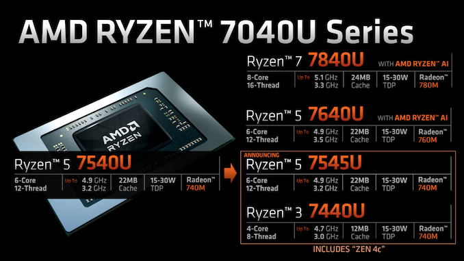 Under the Ryzen 7040U branding, we have two new SKUs: the Ryzen 5 7545U and the Ryzen 3 7440U. The Ryzen 5 7545U packs 6 cores (2xZen4 + 4xZen4C) / 12 threads and can boost up to 4.9GHz. Likewise, the Ryzen 3 7440U hosts 4 cores (1xZen4 + 3xZen4C) / 8 threads and can reach 4.7GHz. Both APUs feature the same Radeon 740M iGPU with 4 CUs enabled.