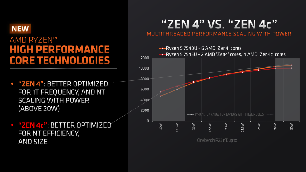 A graph from AMD shows that 6xZen4 cores (Ryzen 5 7540U) are neck to neck against a 2xZen4+4xZen4C hybrid config (Ryzen 5 7545U). Zen4 scales better with more power, making Zen4C a perfect option for laptop designs.