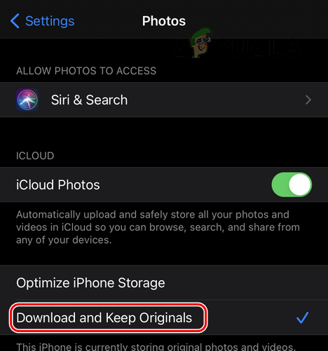 Enable Download and Keep Original in the Photos Settings of iPhone - Restart your iPhone, then activate airplane mode upon restart.