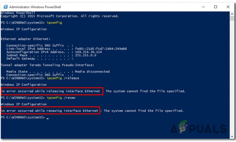 Some Windows users are reporting that whenever they attempt to use an ipconfig command in Command Prompt or PowerShell they end up seeing the ‘An error occurred while releasing interface Ethernet‘ error. In most cases, this error message is accompanied by the message ‘The system cannot find the file specified’ or ‘Unable to Contact your DHCP server’.