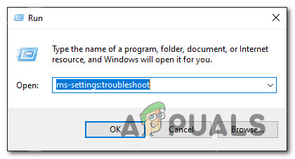 - Press Windows key + R to open up a Run dialog box. Inside the text box, type ‘ms-settings:troubleshoot‘ and press Enter to open up the Troubleshoot tab of the Settings app.