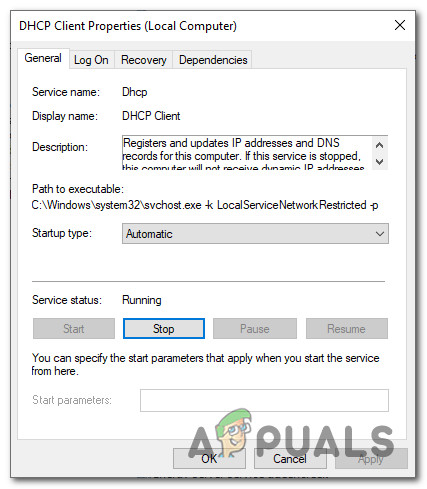As it turns out, another common reason why you might end up being stuck with the ‘An error occurred while releasing interface Ethernet‘ error is a disabled instance of the DHCP client service. This might happen as a result of manual user intervention or after a 3rd party optimization tool ended up disabling this service to save up resources.
