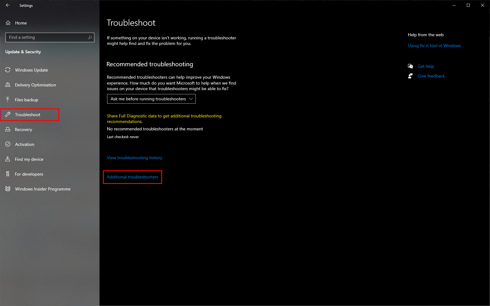 - Go to Update & Security > Troubleshoot > Additional troubleshooters.