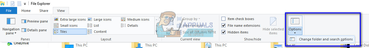 - Press Windows + E to open File Explorer. Click View, then click Options and select Change folder and search options.