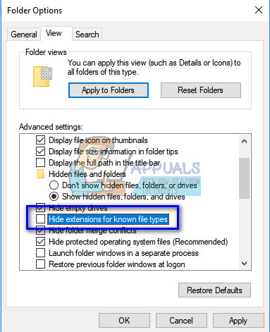- Uncheck the option ‘Hide extensions for known file types’. This will allow you to change the text file into a batch file later.