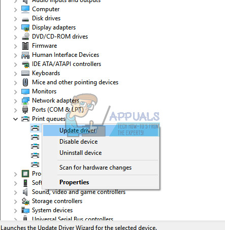 - Expand the “Print queues” section, right-click on your printer’s name, and select “Update driver”.