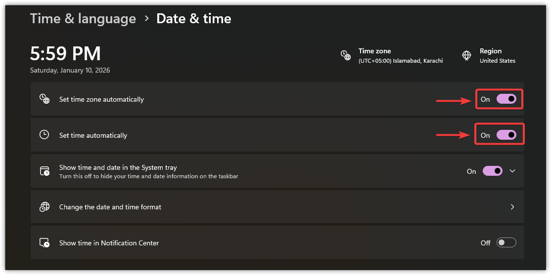 - Enable Set time automatically and Set time zone automatically.