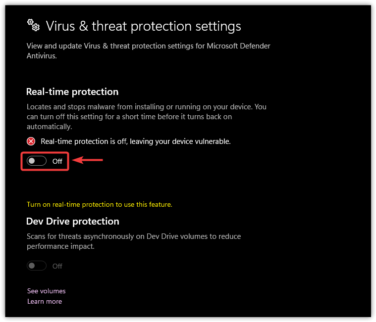 - Temporarily disable real-time protection.
