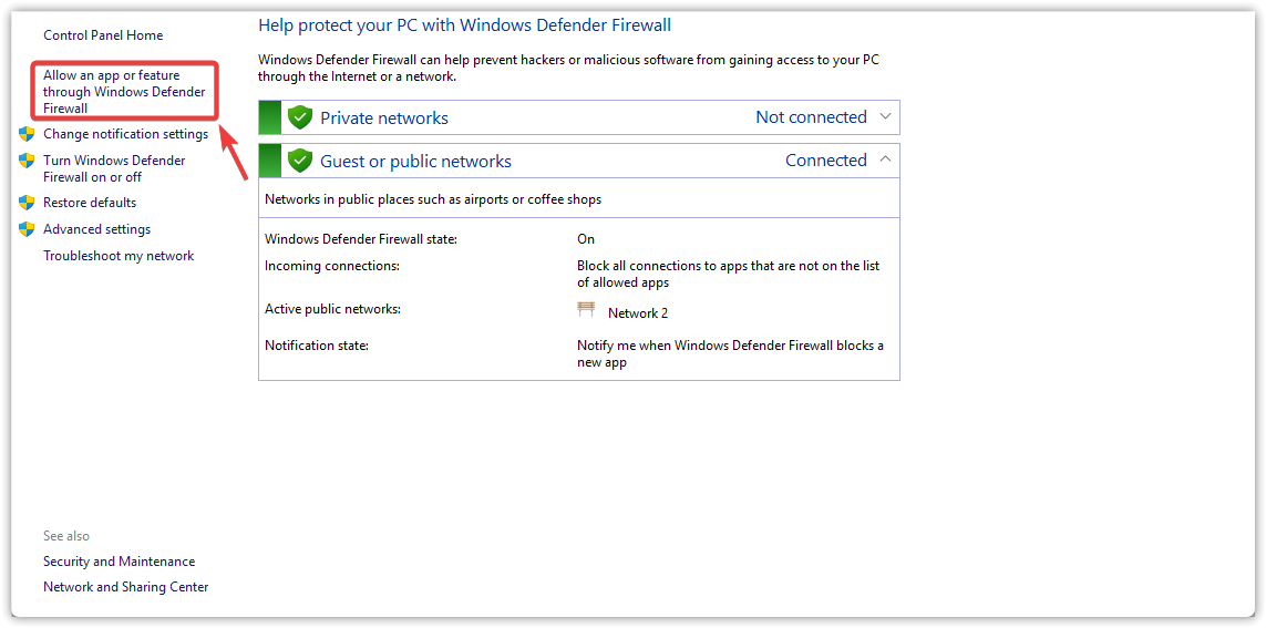 - Click Allow an app or feature through Windows Defender Firewall.