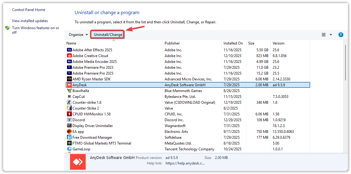 - Locate AnyDesk and uninstall it.