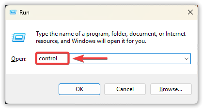 - Press Windows + R, type control, then press Enter.