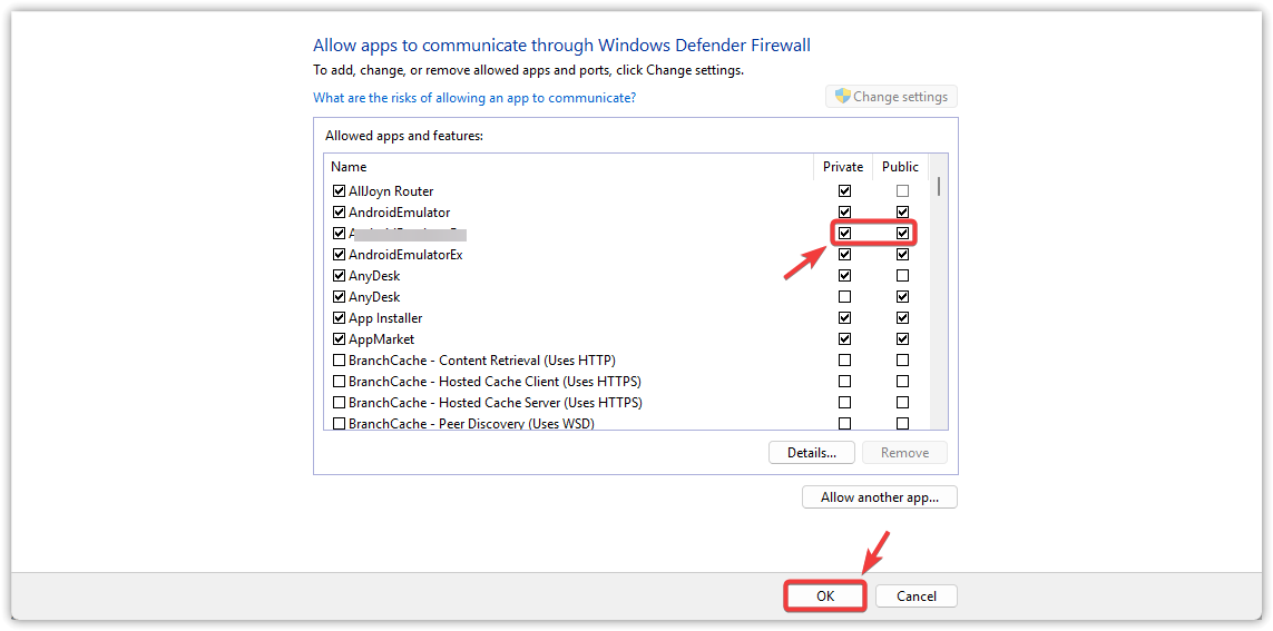 - Locate AnyDesk and enable both Private and Public.