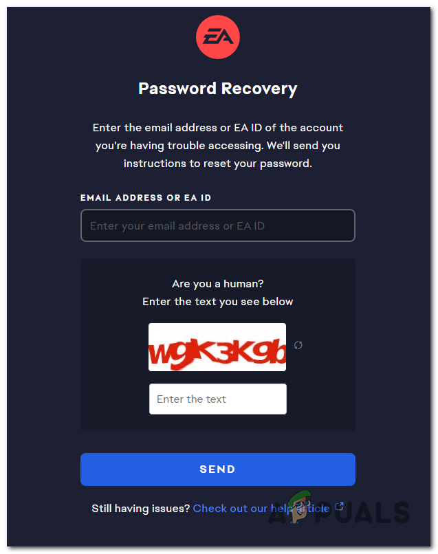 Another place you can reset your EA account password is from the official EA password recovery page. All you have to do is to insert your email or EA ID and confirm that you are not a robot. After that, a mail will be sent to your email address with a link that will let you change your password. Follow the instructions to complete the process.