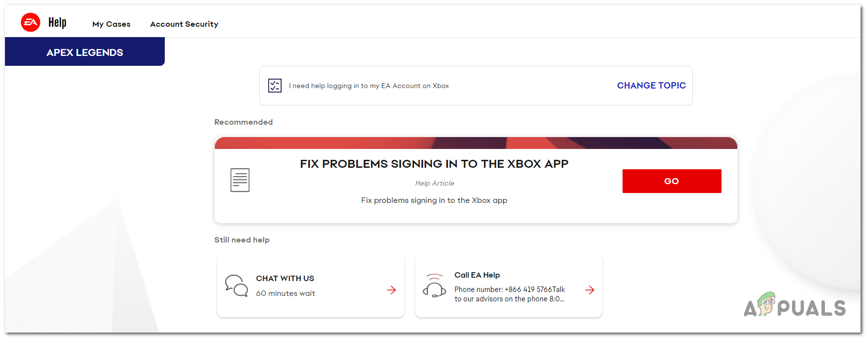 But in case you don’t want to create a report and wait until they give a response, you can also choose the option to chat or call the EA Help center. You can do this from their official EA Help site. You need to search through the list for Apex Legends or any other game that you want to play, then select the question you have and you will be redirected to another page.