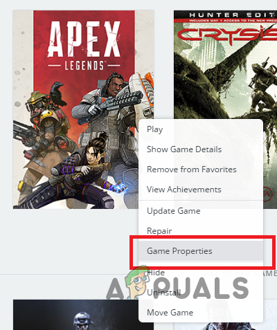 - Go to your game library, right-click Apex Legends, and choose Game Properties.