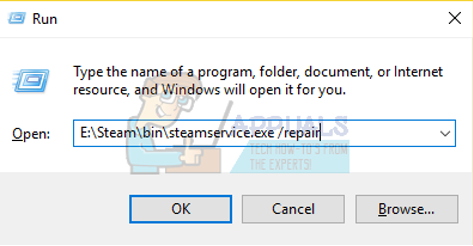 - Type the path to your Steam directory followed by bin, then SteamService.exe /repair. For example: