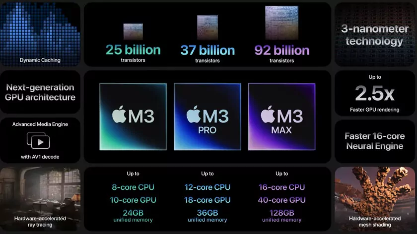 Apple announced it’s M3 lineup today that comprises of a total of three chipsets — M3, M3 Pro and M3 Max. The M3 family is fabricated on TSMC’s 3nm process, promising improved performance and efficiency.