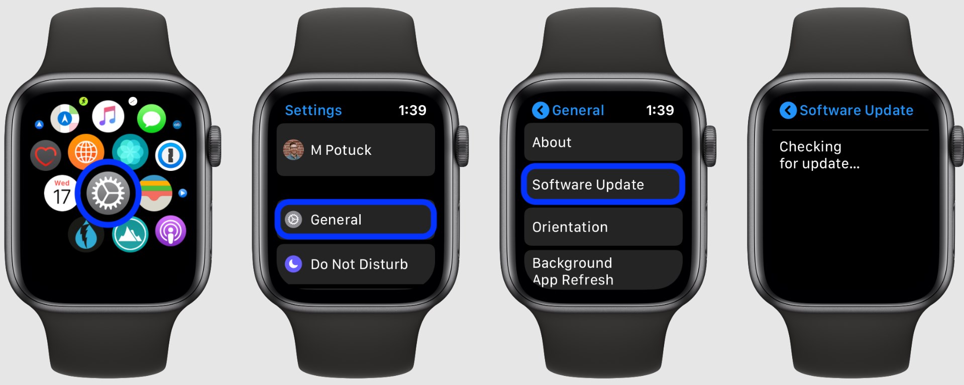 - Tap Software Update. If there’s an update, follow the instructions to install it. Keep the watch on its charger during the update process.