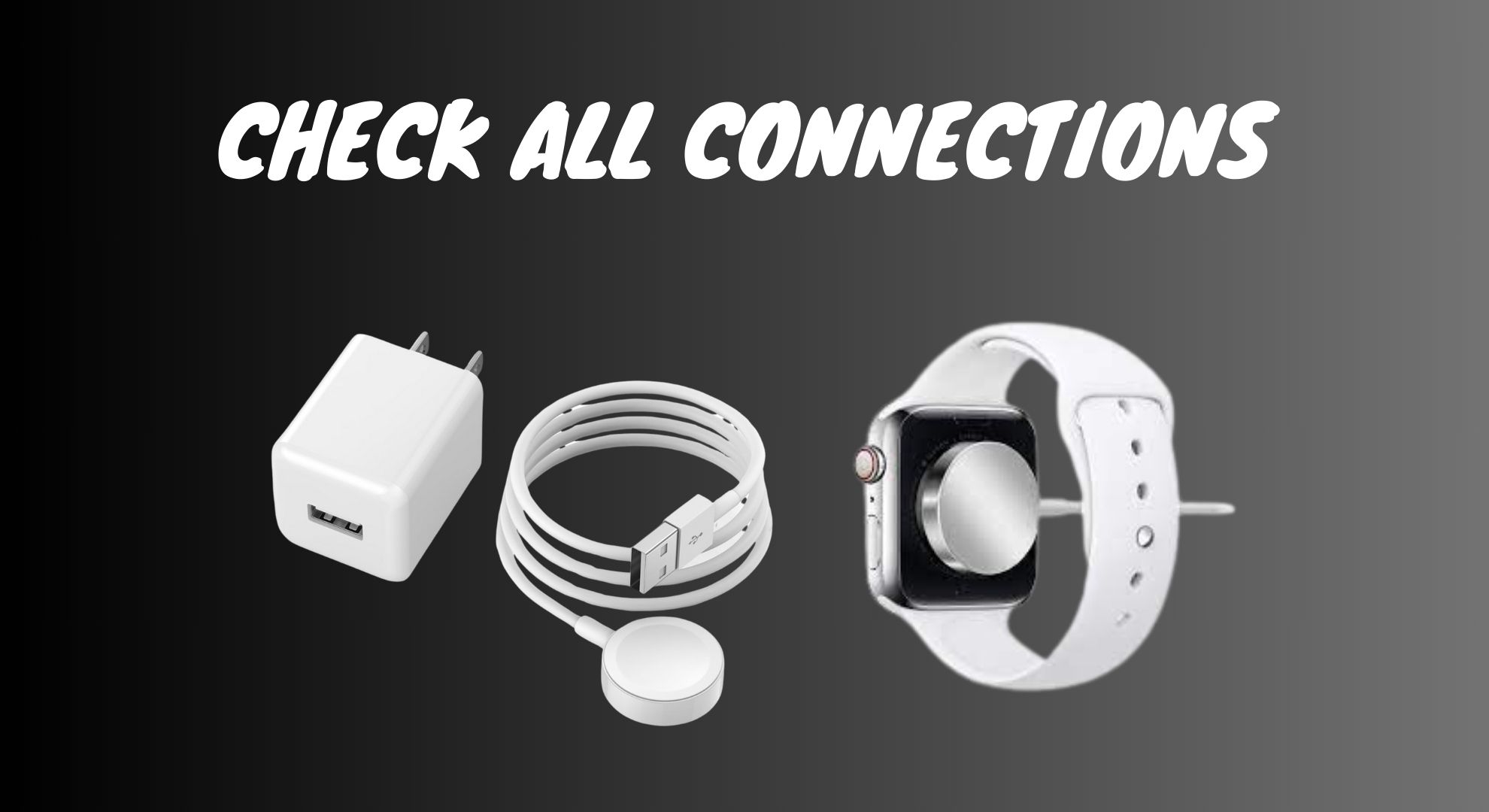 First, make sure that all connections are secure. If you use a dock or stand, double-check that your watch is properly seated. If you’re using a USB-C cable and adapter, make sure the adapter is firmly plugged into the wall and the USB-C cable is securely connected to both the power source and your watch.