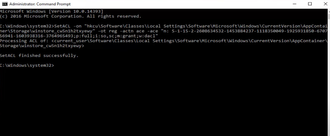 SetACL -on "hkcu\Software\Classes\Local Settings\Software\Microsoft\Windows\CurrentVersion\AppContainer\Storage\winstore_cw5n1h2txyewy" -ot reg -actn ace -ace "n:S-1-15-2-2608634532-1453884237-1118350049-1925931850-670756941-1603938316-3764965493;p:full;i:so,sc;m:grant;w:dacl"