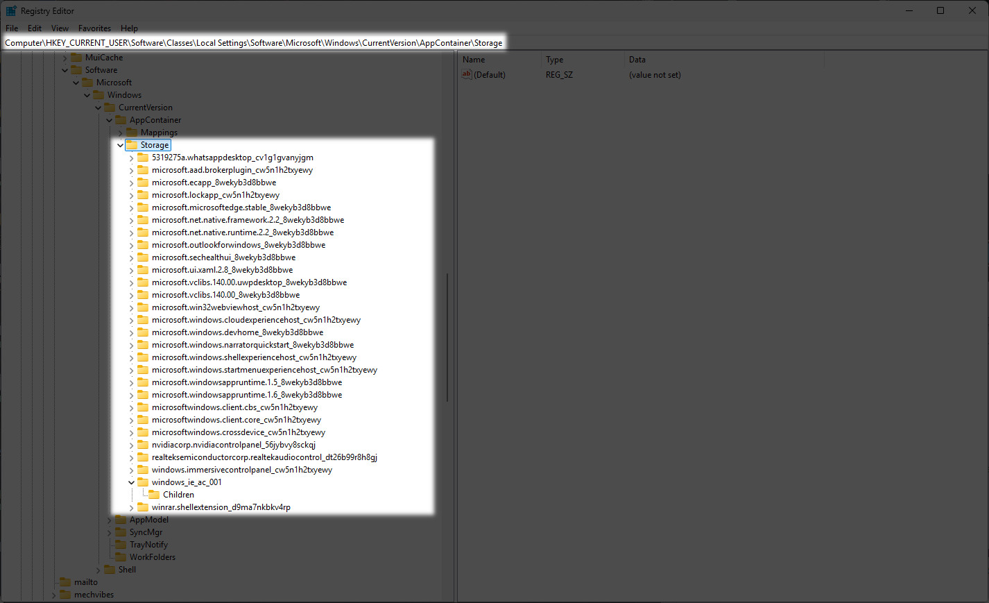 HKEY_CURRENT_USER\Software\Classes\Local Settings\Software\Microsoft\Windows\CurrentVersion\AppContainer\Storage