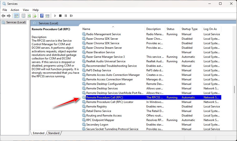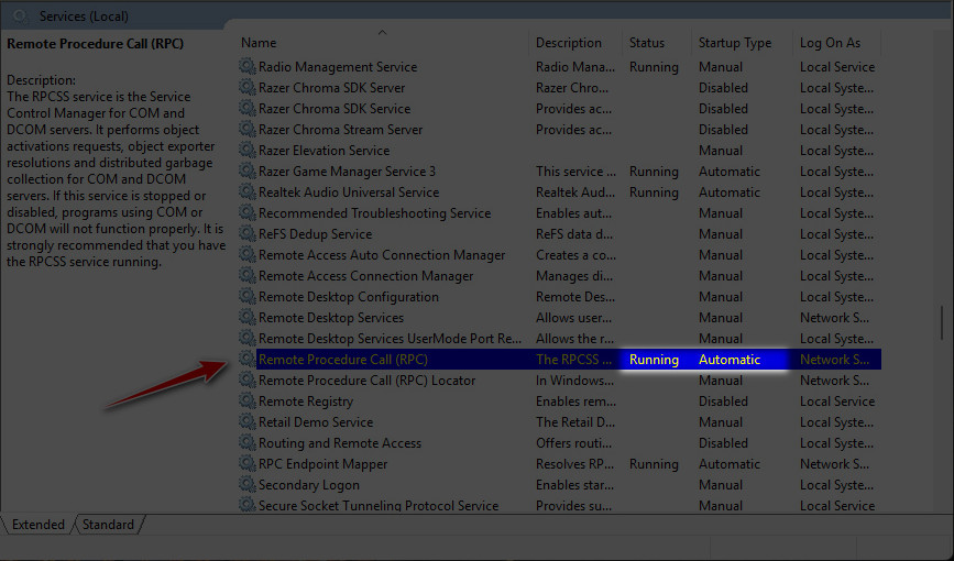 - Scroll to find Remote Procedure Call (RPC) in the list.