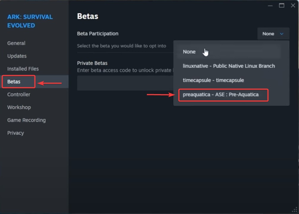 Recently, a compatibility issue caused by an update has affected many players. Several mods were broken by the Aquatica update, which can cause the game to crash or fail during startup. (If you’re using Steam Workshop mods, they are typically managed through ARK’s Workshop page on Steam.) Selecting the “preeaquatica ASE” or “none” beta option reverts the game to a more stable build, which may resolve launch problems triggered by the new patch.