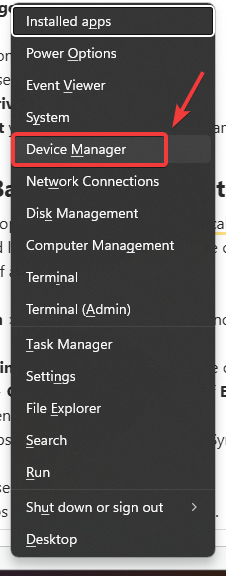 - Press Win + X on your keyboard and select Device Manager.