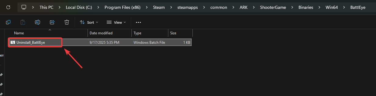 - Locate the file named Uninstall_BattlEye.bat.