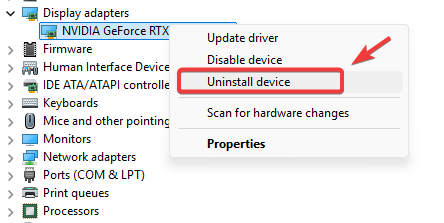 - Right-click your graphics card (NVIDIA, AMD, or Intel) and select Uninstall device.