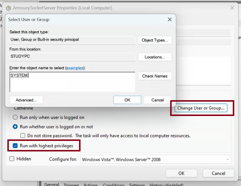 4. Make sure “Run with high privileges” is marked, then click on Change User or Group and make sure the object name is “SYSTEM.”