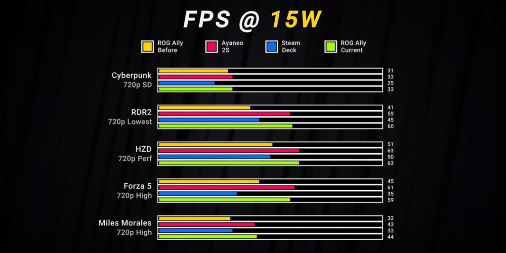 Based on these results, consumers wishing to buy a handheld gaming device should consider the Ally, as it “kills the steam deck” in low power (15W) mode.