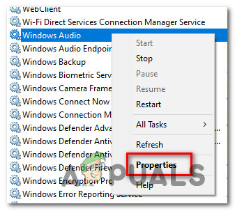 Accessing the Services screen - Find Windows Audio in the list, right-click it, and select Properties.