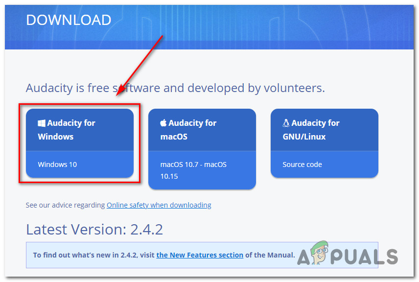 - Go to the official Audacity download page. Download the latest version for Windows and run the installer.