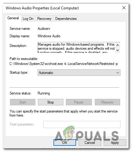 Accessing the Properties screen of Windows Audio - Under the General tab, set Startup type to Automatic and click Apply.